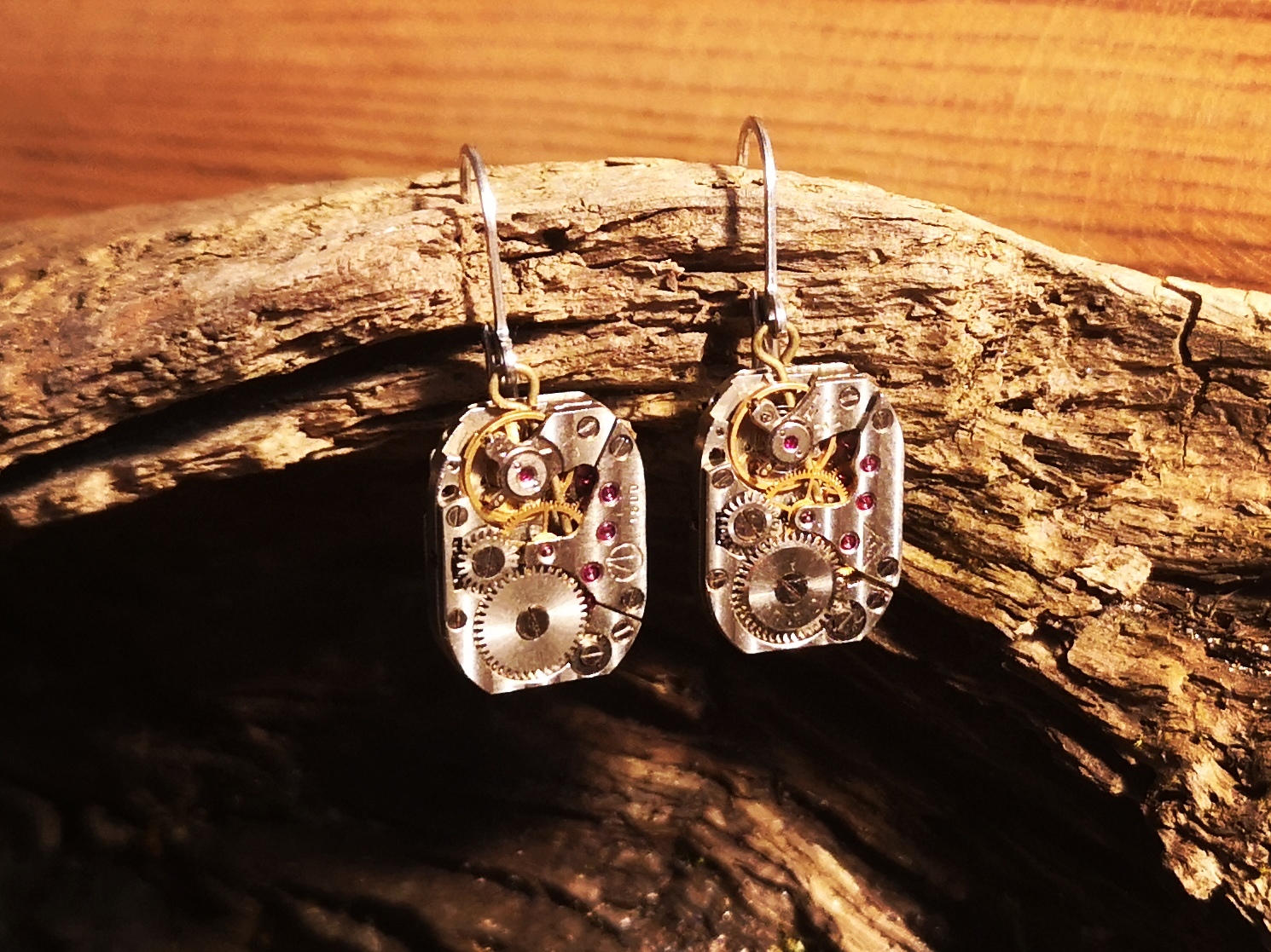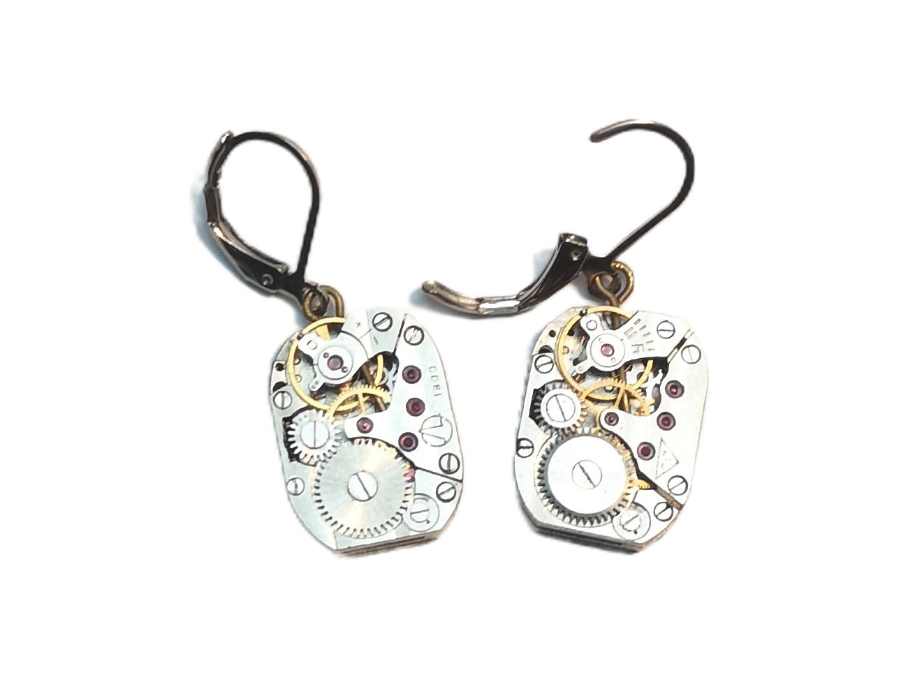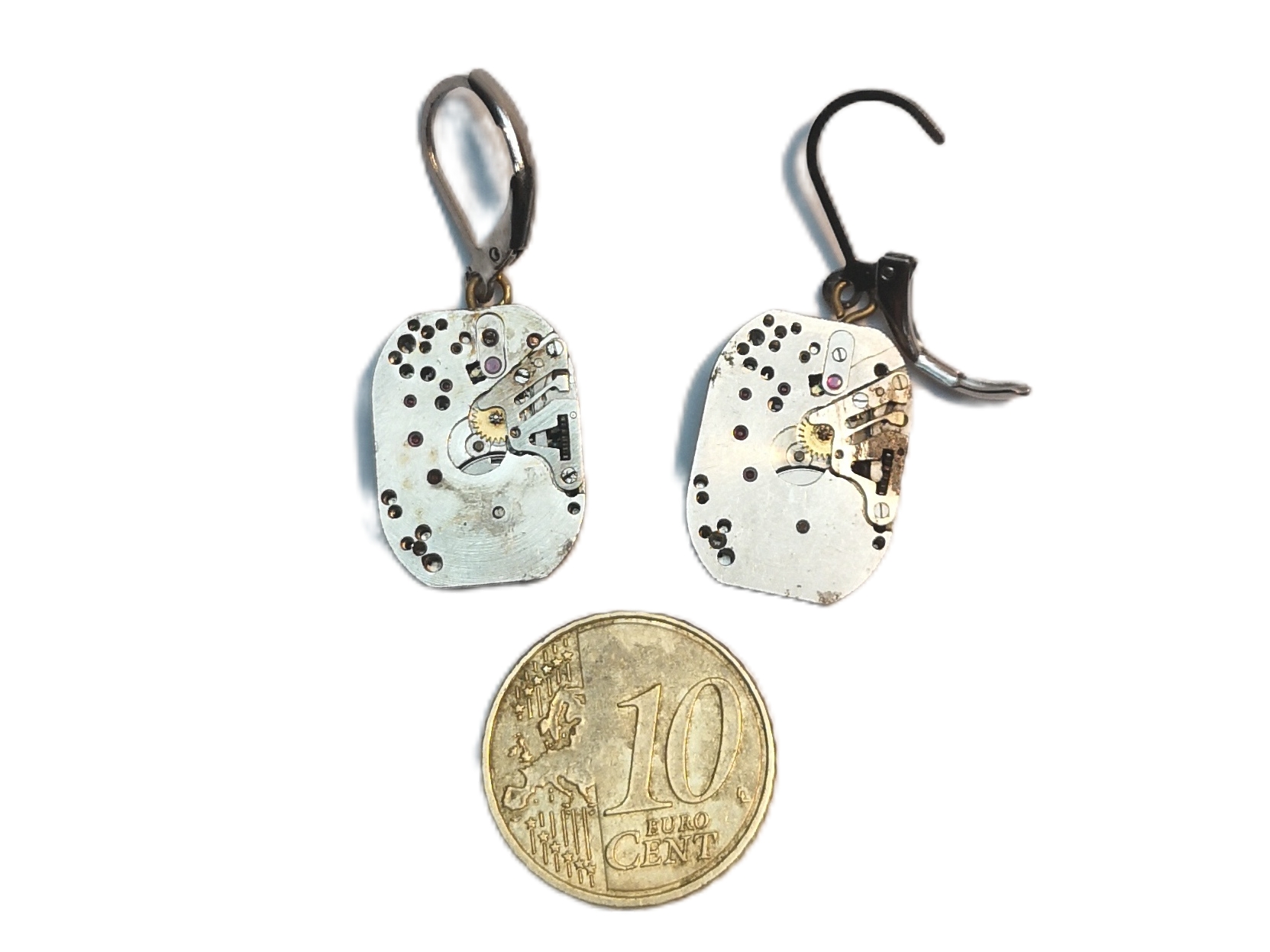 Paire de boucles d’oreilles créée à partir d’authentiques mouvements complets de montres mécaniques anciennes. il s’agit d’anciennes montres bracelets pour femmes.