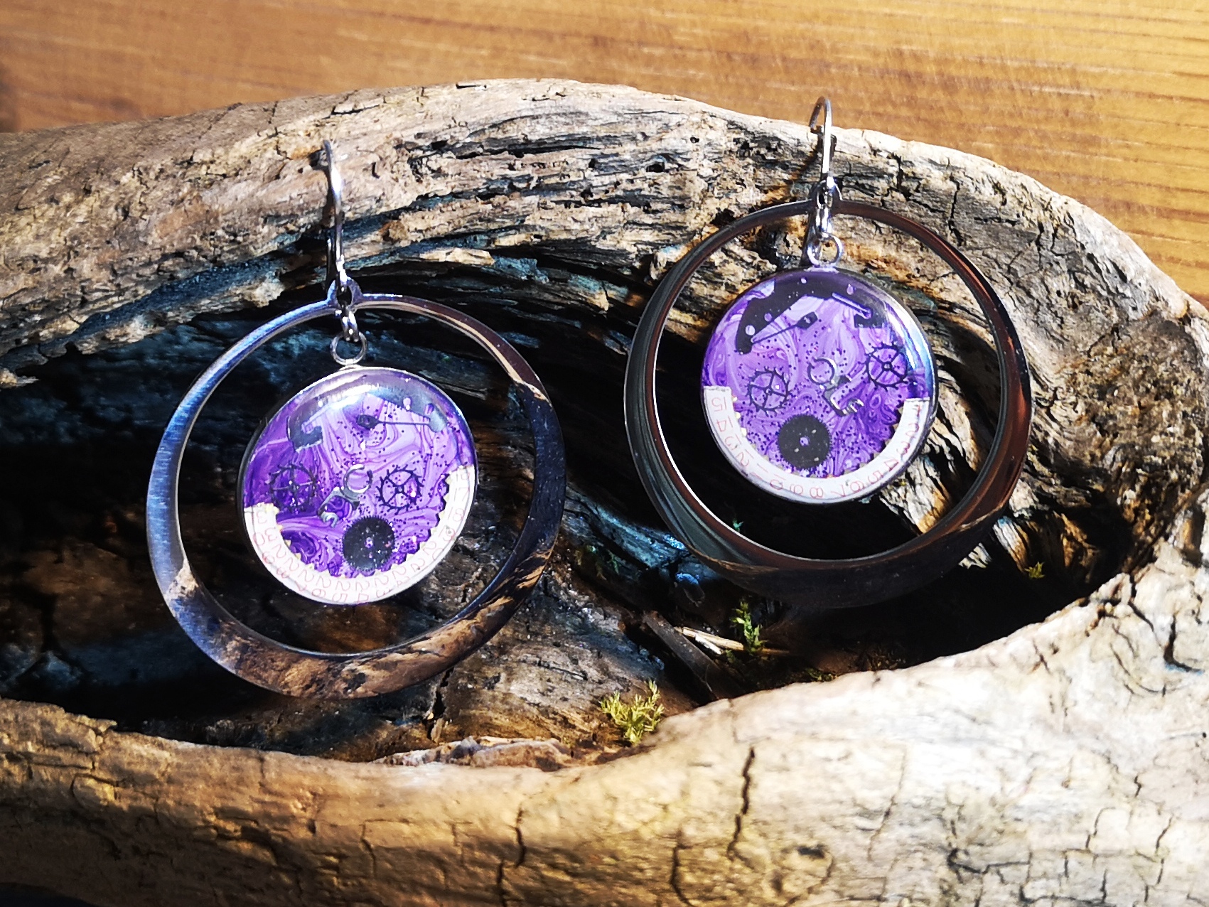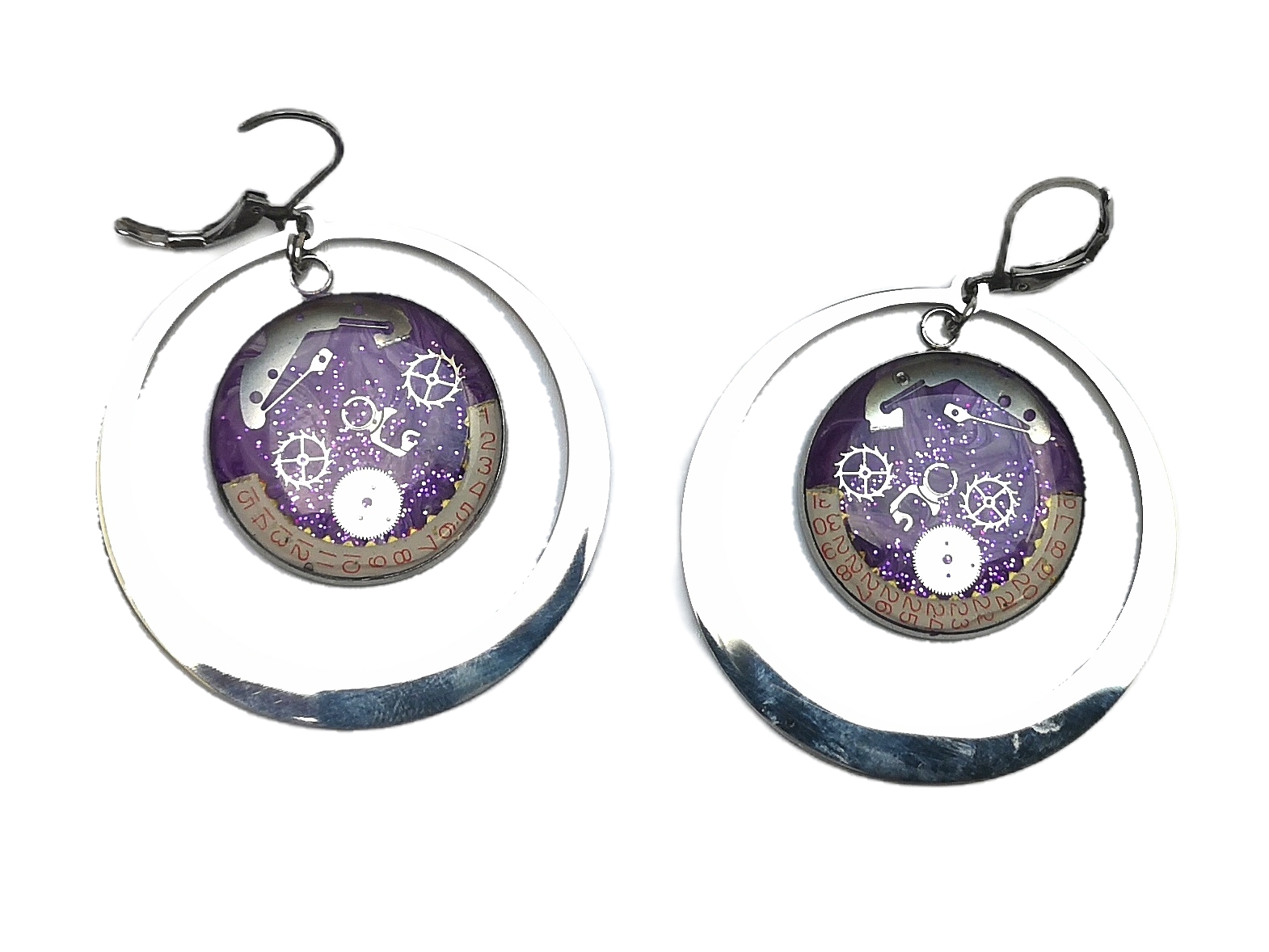 Paire de boucles d’oreilles créée à partir d’authentiques pièces de montres mécaniques anciennes. montage créoles en acier , fond mauve / lavande, modèle original avec résine spécifique bijoux (traitement anti UV).